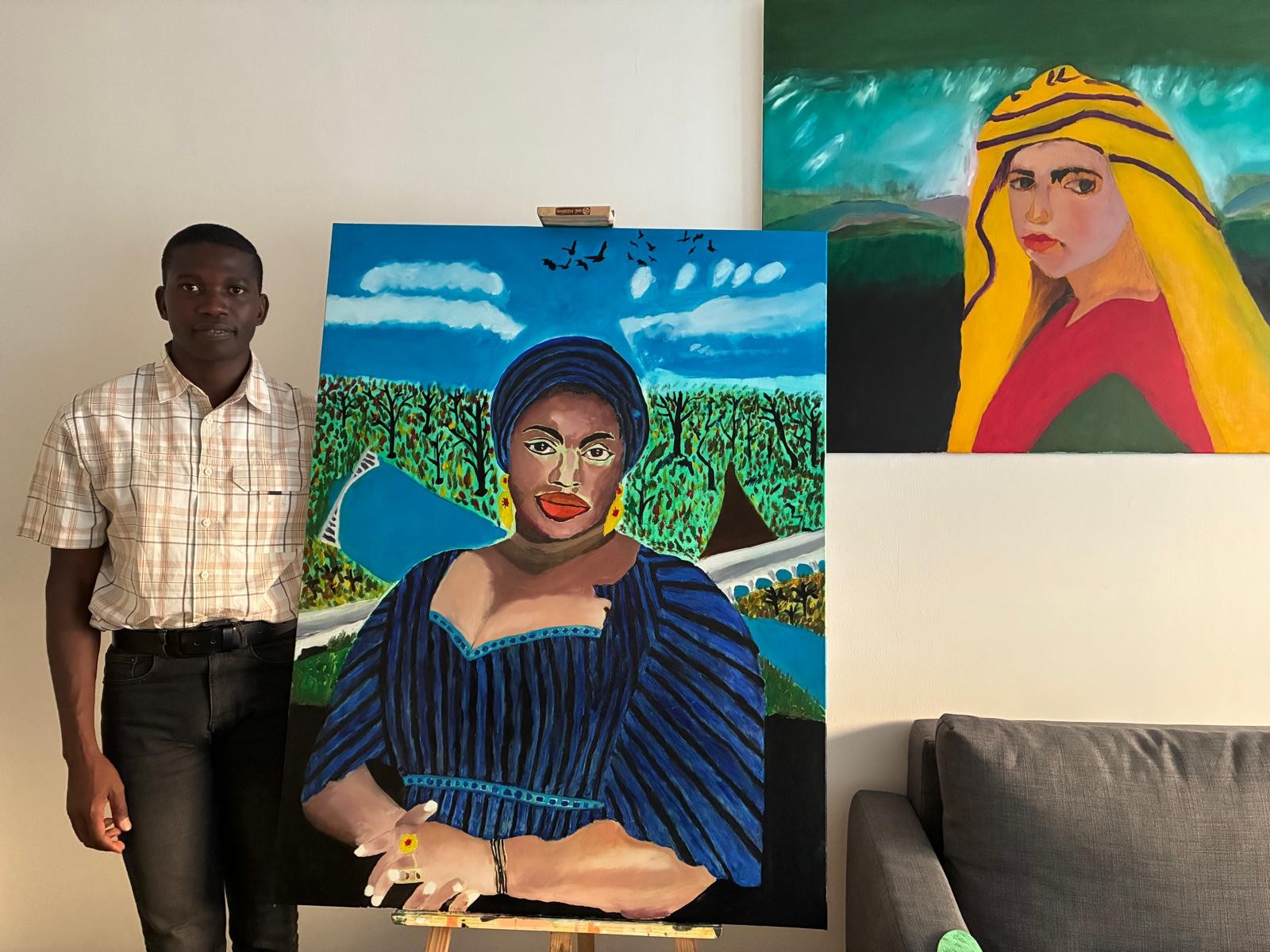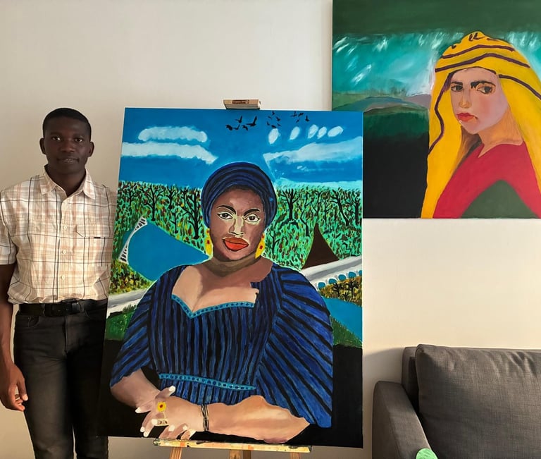 Portrait de Fatouma Kouyaté, jeune artiste guinéenne et descendante de griot mandingue. Résidant à Paris où elle travaille et fait des études d’Art. Peinture à huile sur toile. Année de réalisation : 2025 à Nantes.